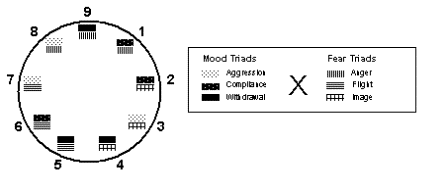 What are those attributes? For the Mood Triads, the three Mood Attributes are Aggression, Compliance, and Withdrawal. For the Fear Triads, the three Fear Attributes are Flight, Anger, and Image. The following two tables depict how these attributes relate to the two Triad collections and the nine types: