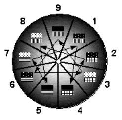 Let's call this collection the "Chou Triads". Note that the Chou Triads are very close to the Mood Triads. If one exchanges the One with the Seven, the Chou Triads become the Mood Triads. In any event, Mr. Chou's 3x3 framework is significantly different from that of Riso/Hudson.